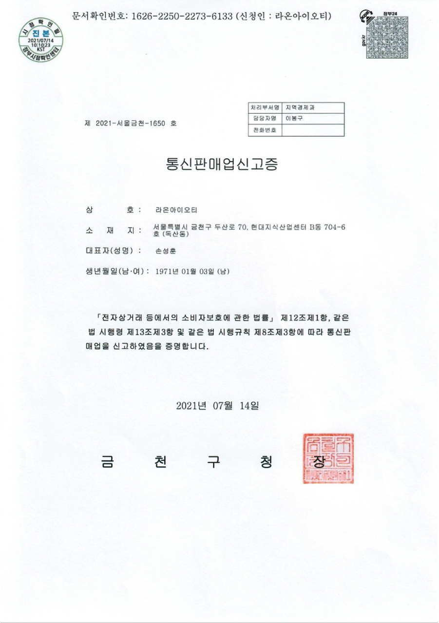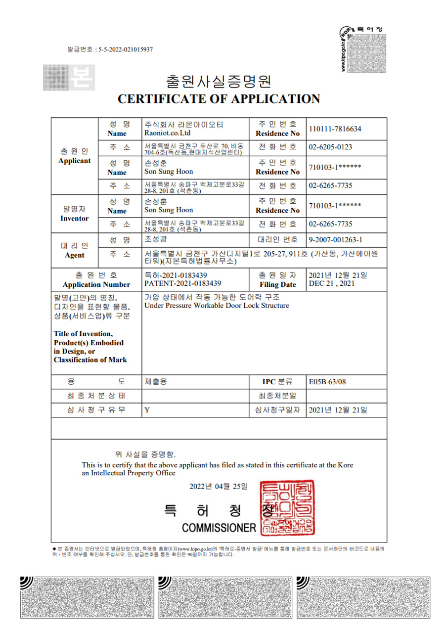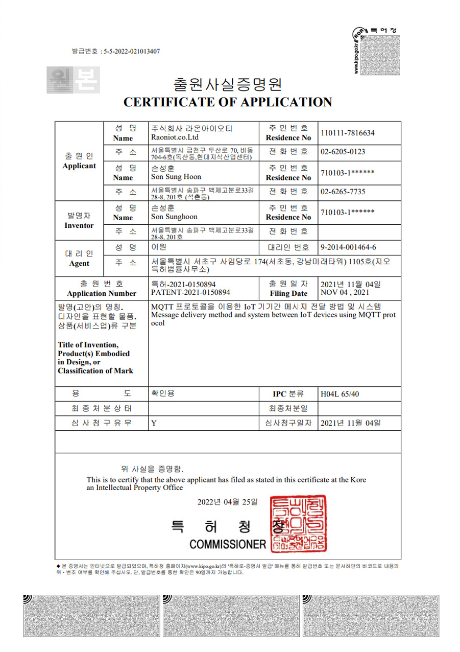 라온아이오티는 기술적 전문성과 품질 관리에 항상 최선을 다하고 있습니다. 이를 증명하기 위해 우리는 국내외에서 인증을 받았으며, 특허를 등록하고 있습니다. 이를 바탕으로 우리는 항상 뛰어난 제품과 서비스를 제공하며, 고객 여러분의 만족을 최우선으로 생각하고 있습니다.