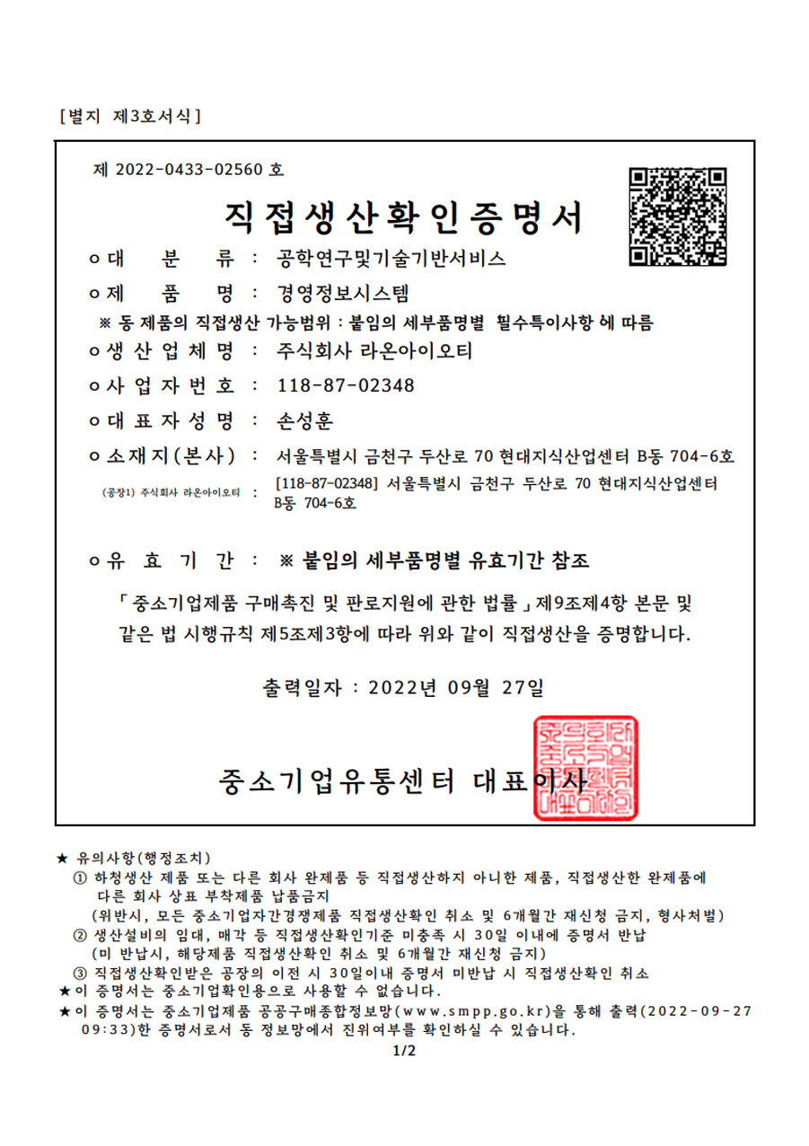 (주)라온아이오티 IOT연구소 인정
